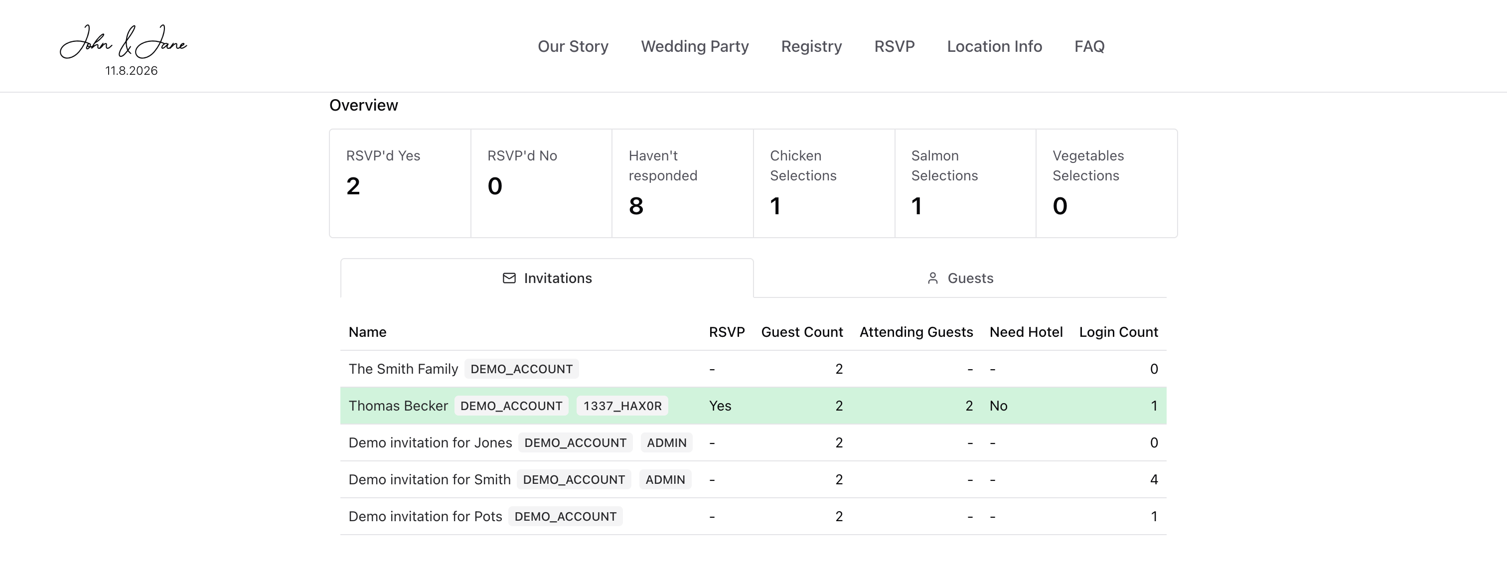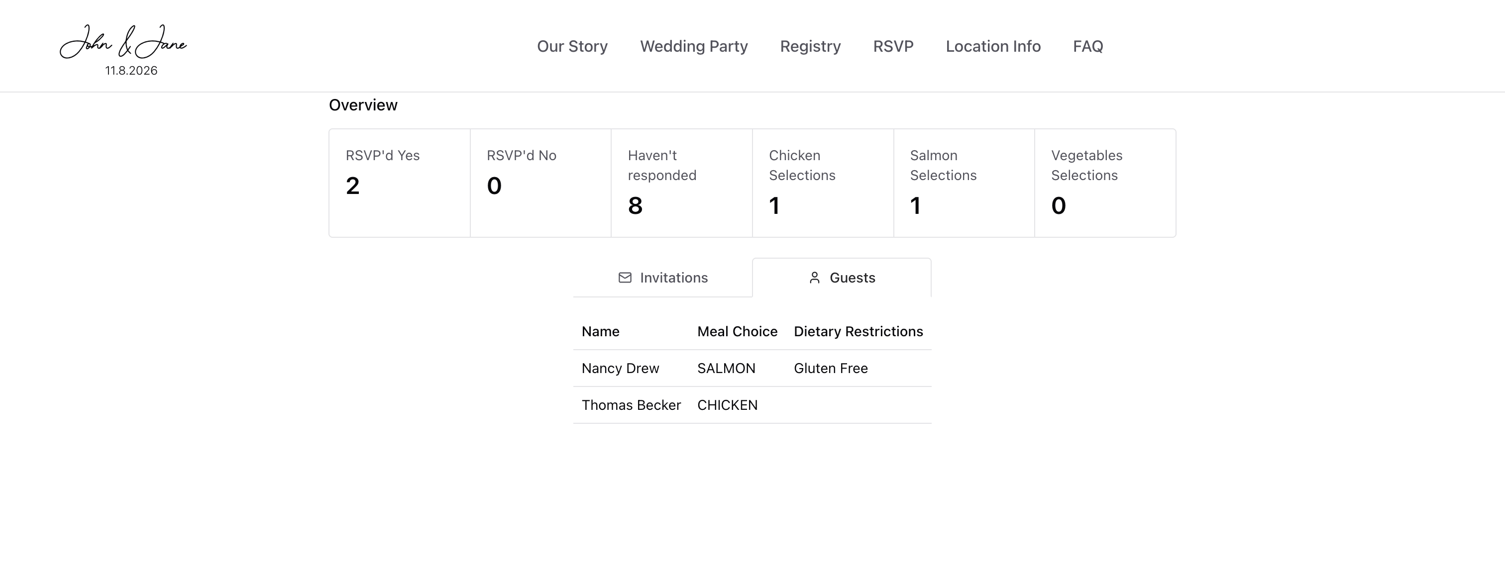 While eagerly awaiting the responses from our guests, I built us some protected admin pages into the website to track the progress of our responses, and to be able to export the data we and our vendors needed, such as meal choices and wedding gift details.