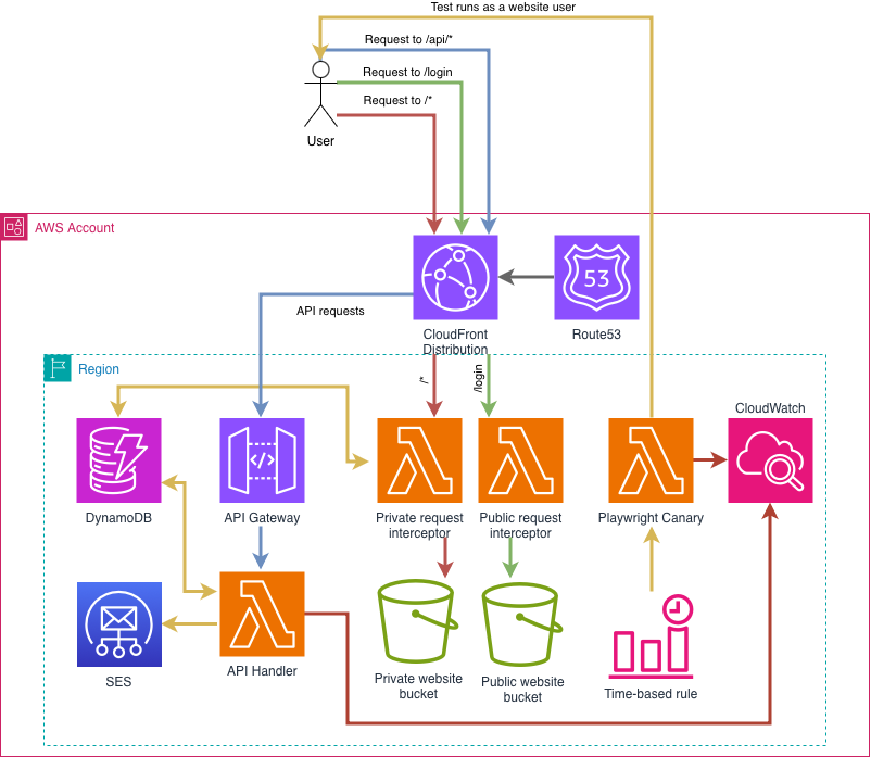 The actual API was hosted on API Gateway, and both the API and the website were served using a CloudFront distribution which not only served the content quickly but also allowed me to easily add authentication logic to all of the access points. I used AWS’ Cloud Development Kit (CDK) to model and deploy all of this infrastructure.