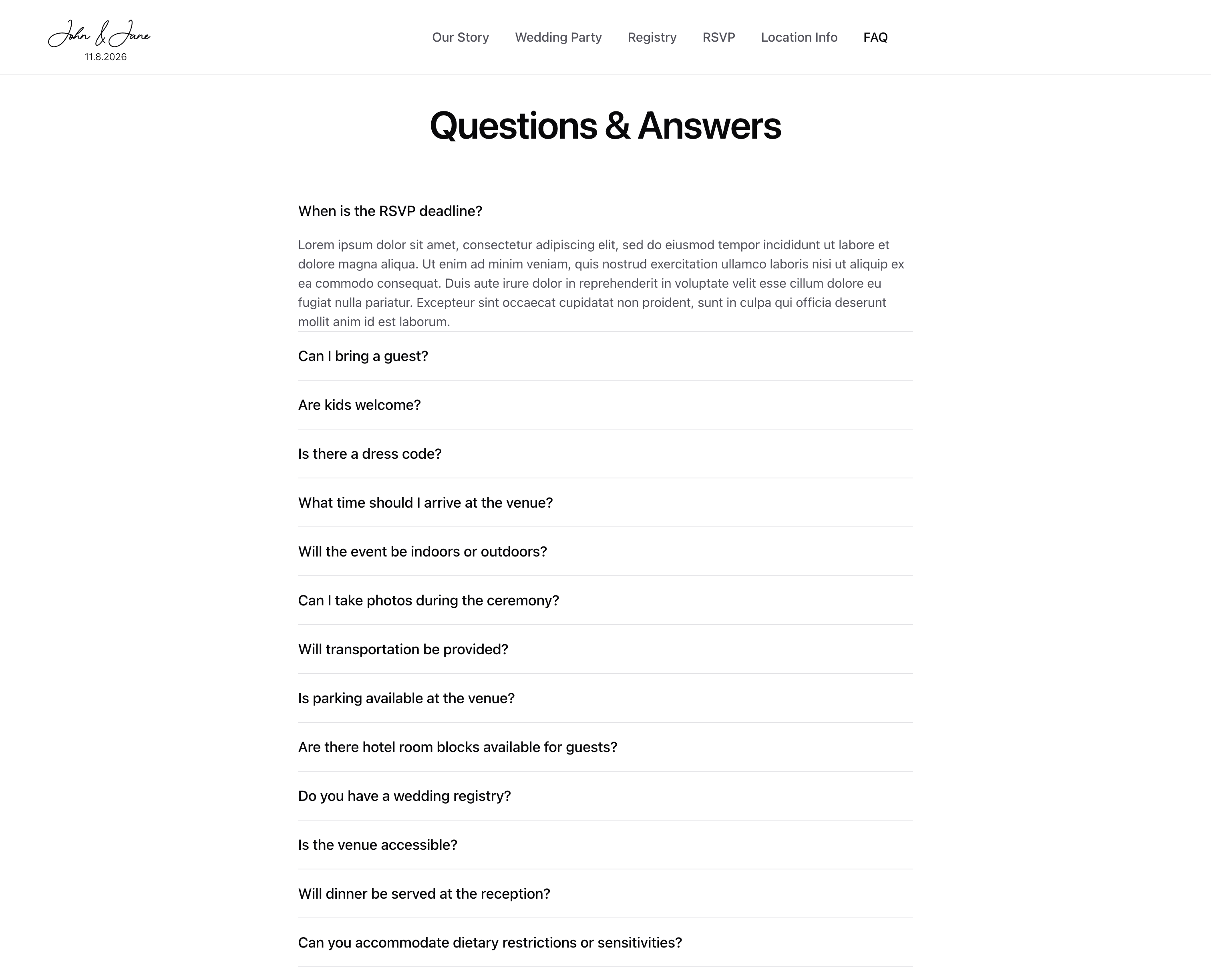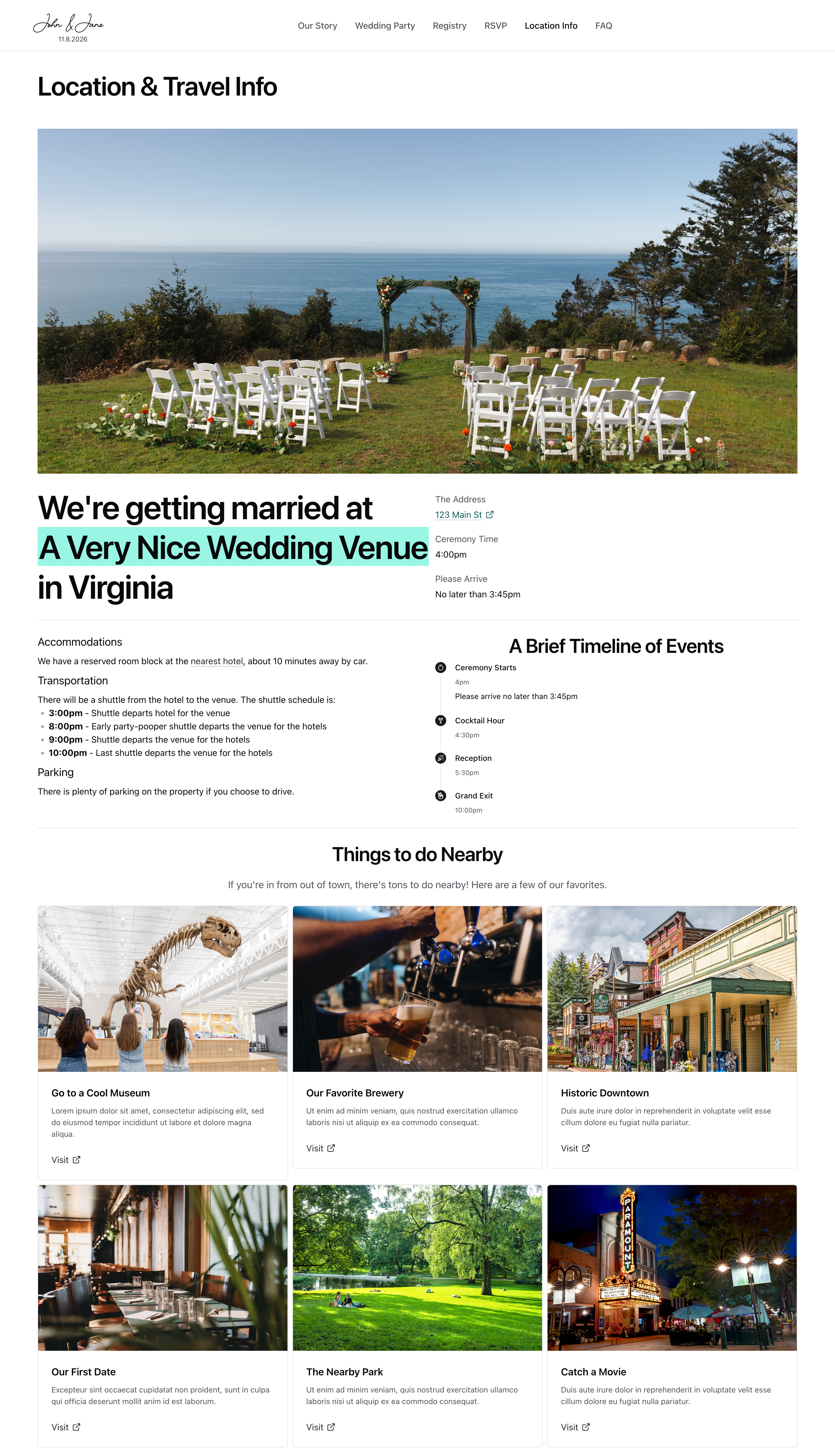 Almost every aspect of a wedding can be obsessed over and tweaked to the couple’s satisfaction, but the website is frequently not among these details. I personally was willing to spend more time and money to have a website experience free of advertisements, unwanted links and logos, or unchangeable components that could detract from the guest’s experience.