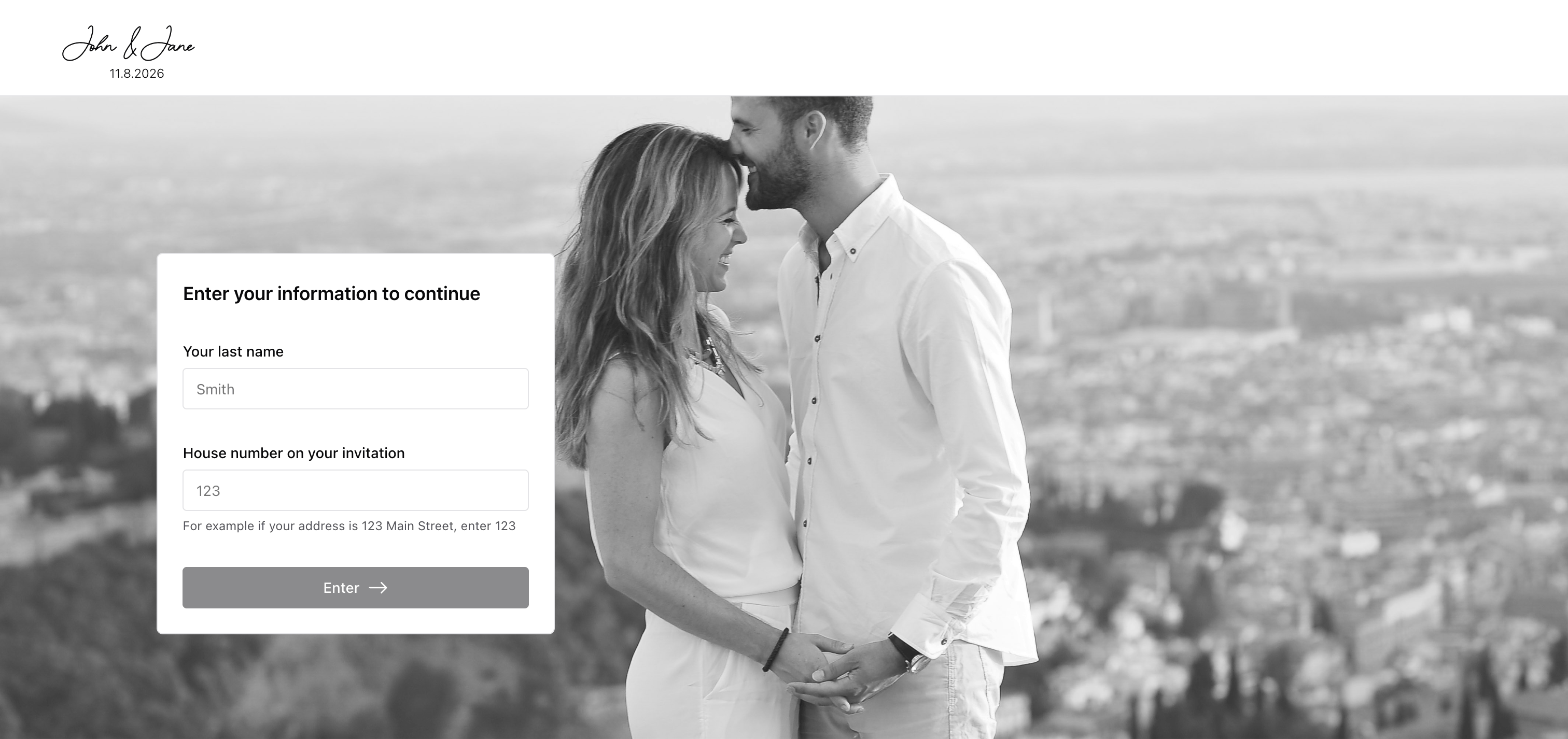 Rather than relying on a password or “trivia check,” I wanted to allow invitees to access the website using something that would uniquely identify them, and something they (or at least those close to them) would know. I landed on a combination of using last name and house number, which makes it both easy to uniquely identify a household that had received an invitation, as well as reasonably difficult to guess someone’s log in information. I used just the house number, instead of the full address, since addresses can be written in multiple ways that would be hard to programmatically match (for example 123 Main St vs. 123 Main Street).