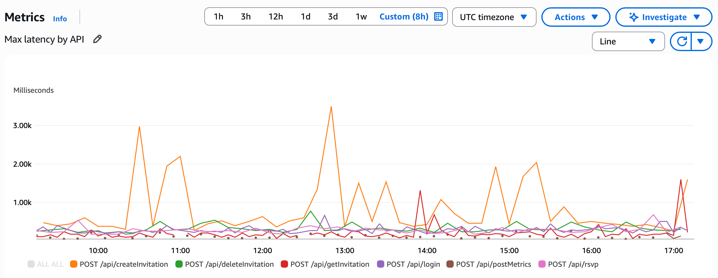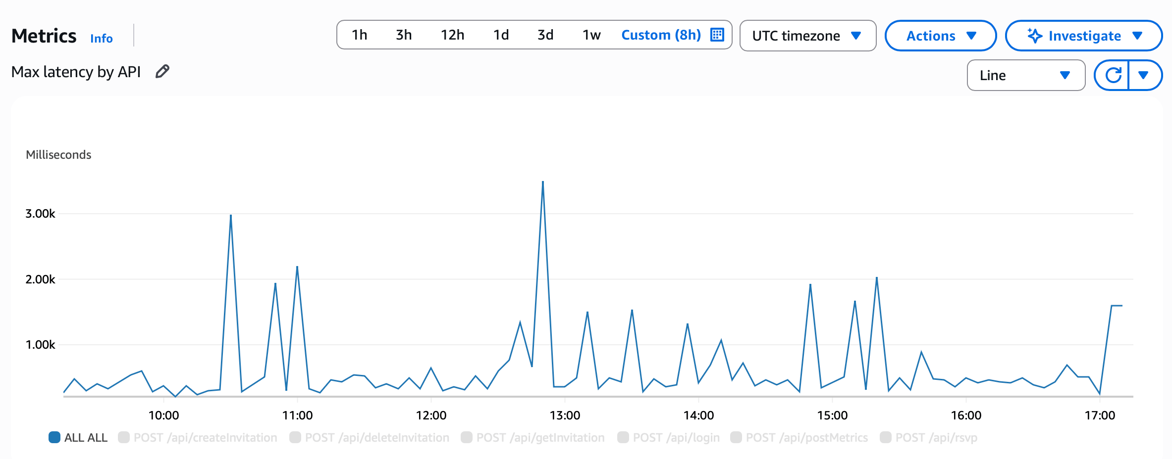 On the server side, I used the @aws-lambda-powertools/metrics library to post metrics emitted by the server or from the client to CloudWatch using the embedded CloudWatch Logs format, to avoid synchronous latency added by calling CloudWatch APIs as part of the request. As part of this process, I discovered that the CloudWatch metrics aggregations worked a bit differently than the model I had in my head – what I really wanted was the ability to alarm on a top-level aggregate metric, such as unhandled errors on any page on the website. If alerted, I wanted the ability to break that metric down to a list of unhandled error metrics for each page, to quickly determine what page was at issue before turning to the logs.