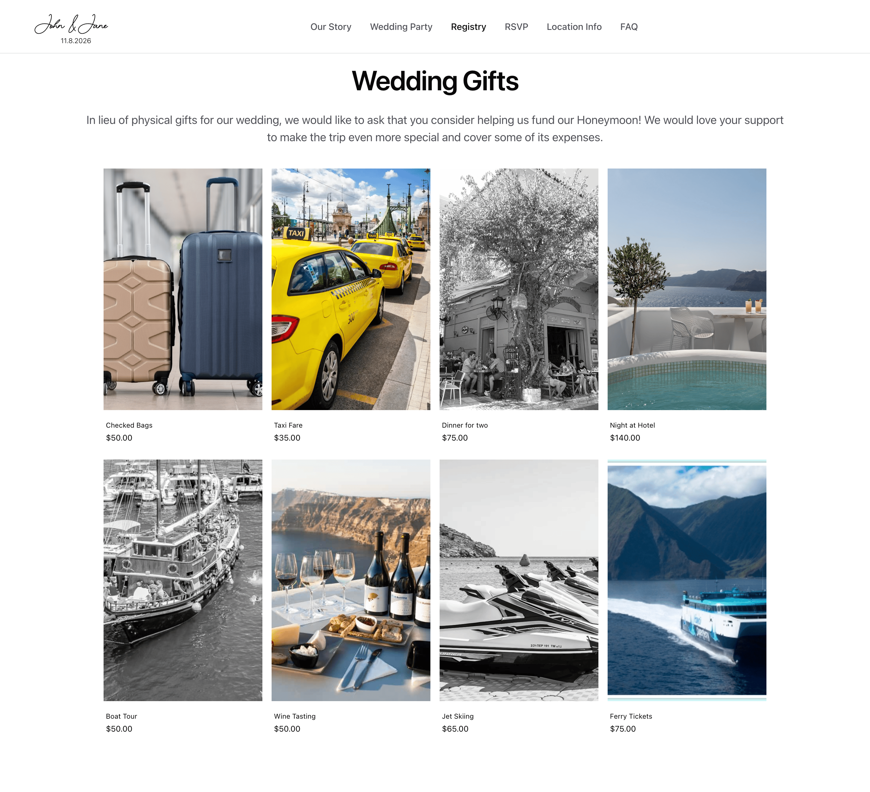 I find that this is especially true when dealing with an online Gift Registry, which often bounces guests through multiple other websites and can be confusing to navigate. A lot of wedding websites will also have a general Cash Fund option in their registry implementation, but our vision was to be more specific and allow our guests to choose exactly what experience they were contributing cash to, if they chose to do so. We felt that this created a much more satisfying and intimate gift giving experience, even if the end result is still just giving cash.