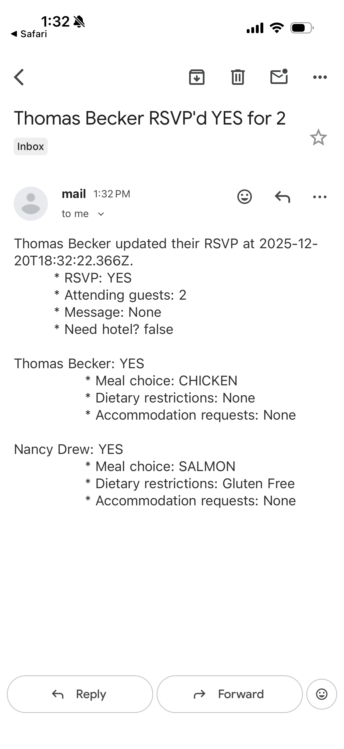 When a guest changed their RSVP, we eagerly wanted to know. So, I also integrated our backend with Simple Email Service (SES) to send my wife and I a simple email update whenever this happened: