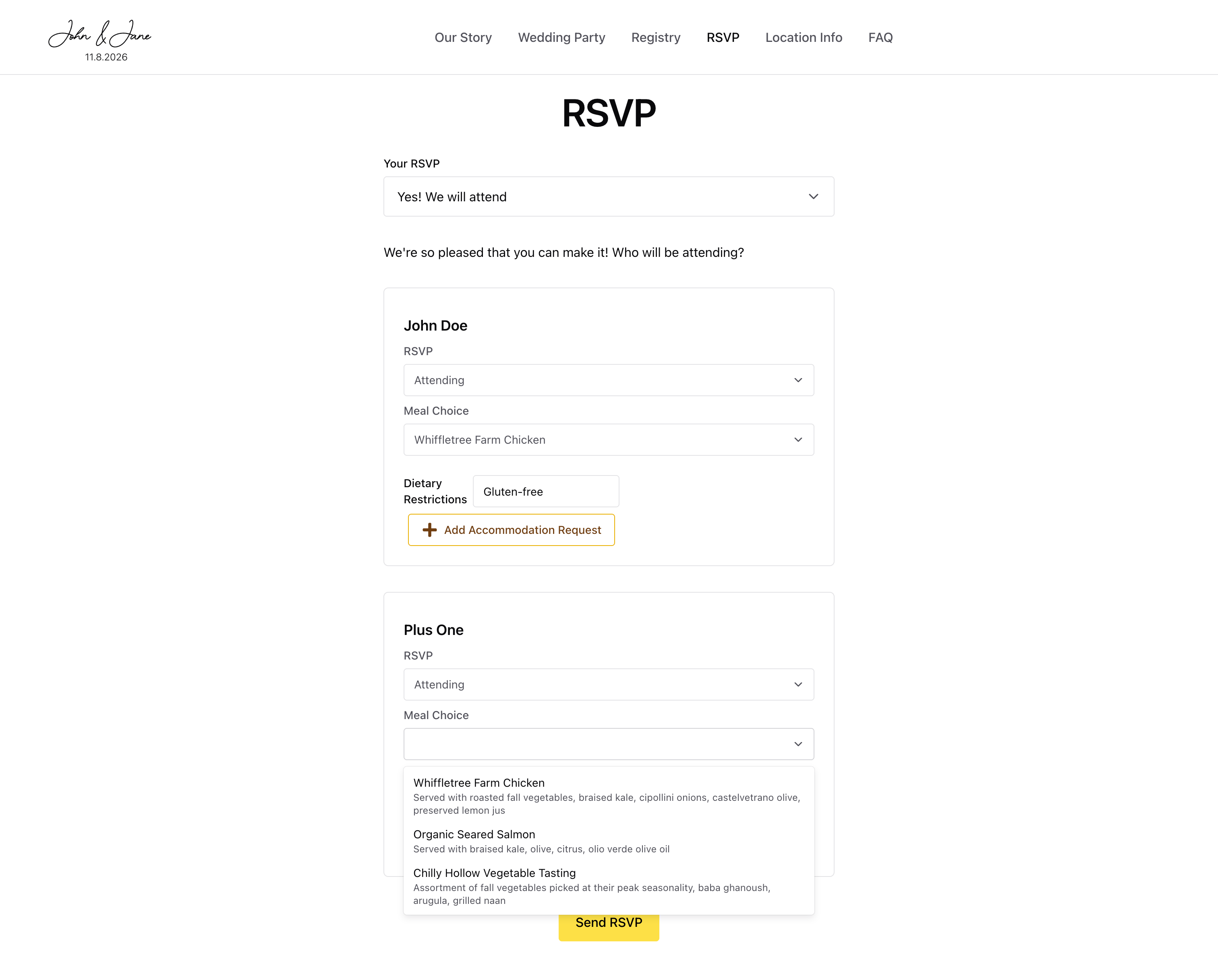 Since we opted to have a plated dinner at our reception, we needed to know more than just how many people were coming. We needed to have a list of who specifically was coming to place them on our seating chart, along with their meal choice and any dietary restrictions. This included any Plus Ones, so I’d need a way to allow guests to provide their names and meal information in the RSVP form too.