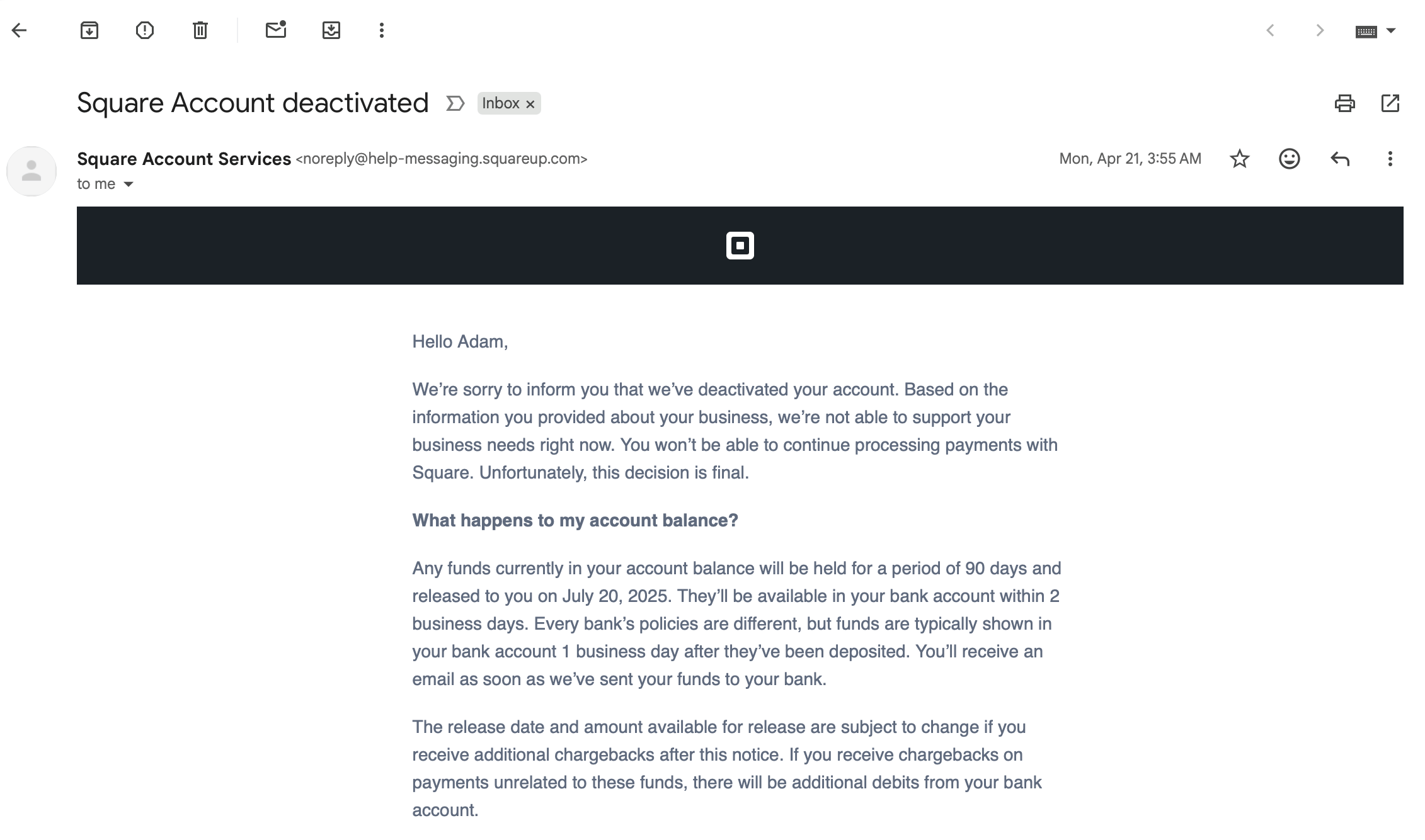 Sometime around 1:30am after hours of bashing website bugs, we ran into a problem we couldn’t figure out. Suddenly, the registry wasn’t working and was returning vague 403 errors in the console when we tried to complete a payment. I had been hot-fixing some bugs and deploying straight to the website so I tried to roll a few of these changes back with no success. My brother had a hunch that we had triggered some sort of fraud detection with our testing and prompted me to log in to Square, where sure enough I had a notice that my account required “additional information” in order to continue. I filled out the information they had requested from me, but in the morning I woke up to the following email: