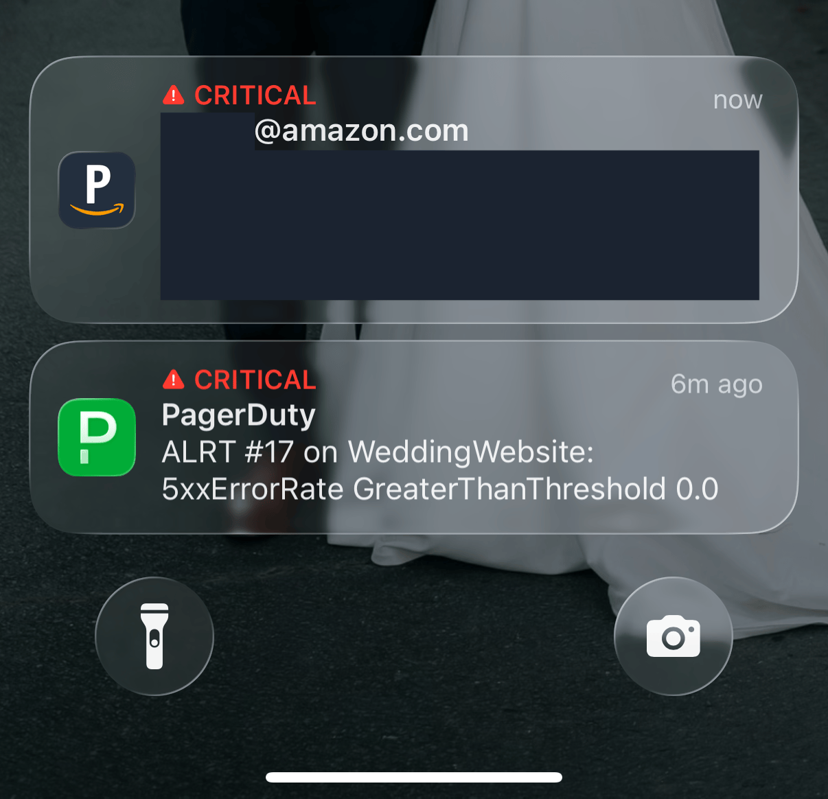 A funny thing that happened to me as a result of having this paging setup which monitored my service running on AWS, while also working at AWS, was that I happened to be on-call for our team in EC2 during the recent DynamoDB event in us-east-1, and started receiving pages from both our internal monitoring systems and my wedding website: